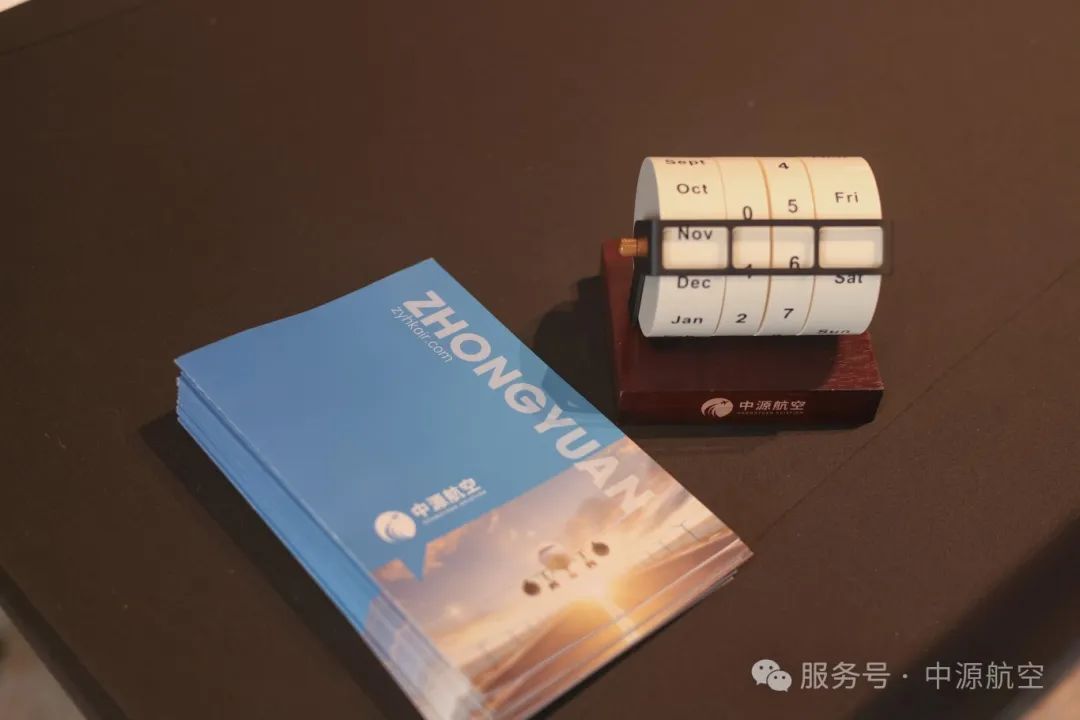 Bathed in Zhongyuan’s signature palette, our booth pairs sleek, state-of-the-art displays with a continuous loop of our corporate film—clean, high-impact, and designed to convey both brand identity and strength at a glance. To every visiting partner we presented a tailored keepsake: a retro perpetual calendar engraved with the Zhongyuan Aviation logo, a small yet symbolic reminder that while we honor timeless values, we are relentlessly charting a future of innovation.