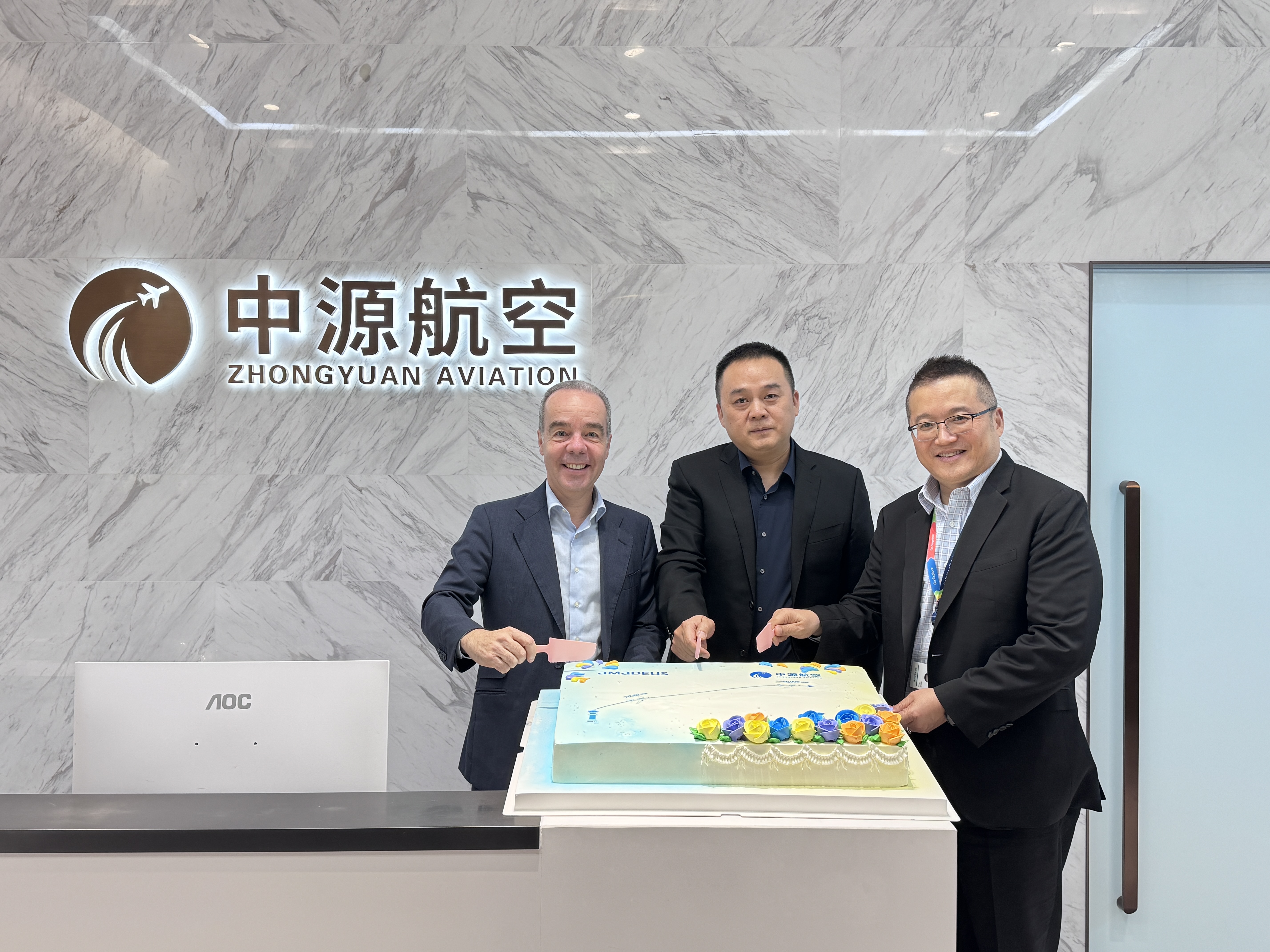 As the celebration continued, Mr. Javier and Mr. Brian of Amadeus joined Mr. Li Chenggong, Chairman of Zhongyuan Aviation, in a ceremonial cake-cutting, marking this significant moment of achievement.